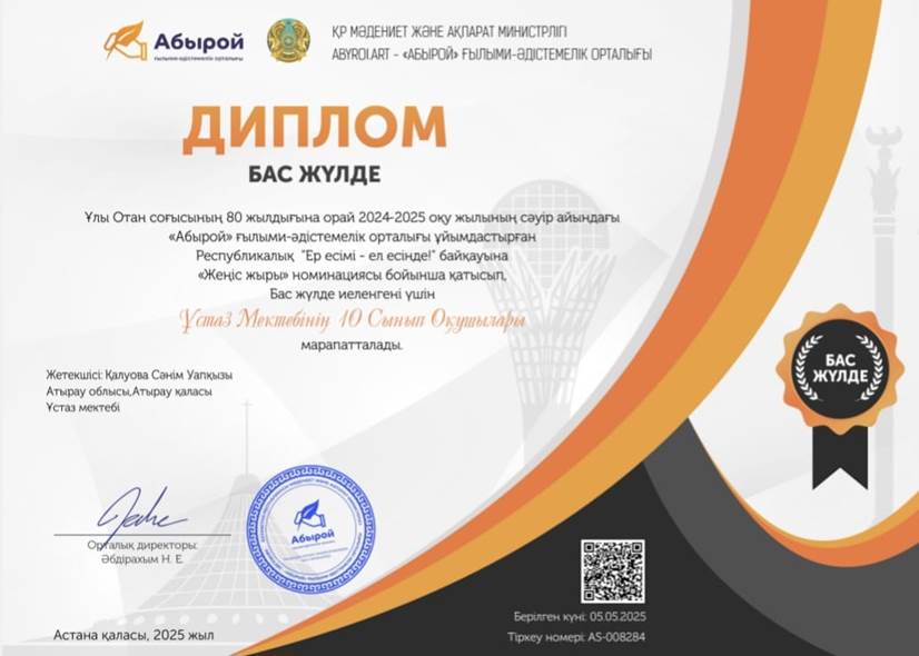 In honor of the 80th anniversary of Victory in the Great Patriotic War, 10th-grade students won the Grand Prize in the “Zhenis Zhyry” competition organized by the “Abyroi” Scientific-Methodological Center.