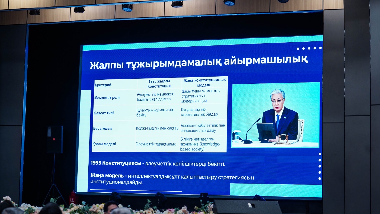 Жиынның бірінші бөлімінде Жаңа Конституцияның негізгі бағыттары мен құқықтық қырлары талқыланды. Тарих ғылымдарының докторы, профессор Сайпулла Сапанов Конституцияның тарихи маңызы мен қоғам дамуындағы рөліне тоқталды. Заң ғылымдарының кандидаты, профессор Жанна Шаяхметова жаңа Конституциядағы құқықтық мәселелер, адам құқығы мен бостандығына берілетін кепілдіктер туралы баяндама жасады.