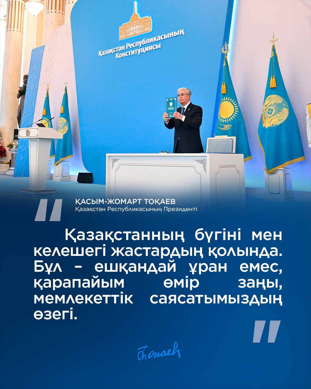 ҚР Президенті Қасым-Жомарт Тоқаев Қазақстан Республикасының Конституциясын қабылдауға арналған салтанатты жиында сөйлеп, ел дамуының бүгінгі бағыты мен болашағы жастардың қолында екенін атап өтті. Мемлекет басшысы Конституция — ел өмірінің негізгі заңы, мемлекеттік саясаттың өзегі әрі қоғам тұрақтылығының кепілі екенін айтты. Президенттің сөзінше, жас ұрпақтың білімді, жауапты әрі белсенді болуы Қазақстанның табысты келешегін айқындайды.