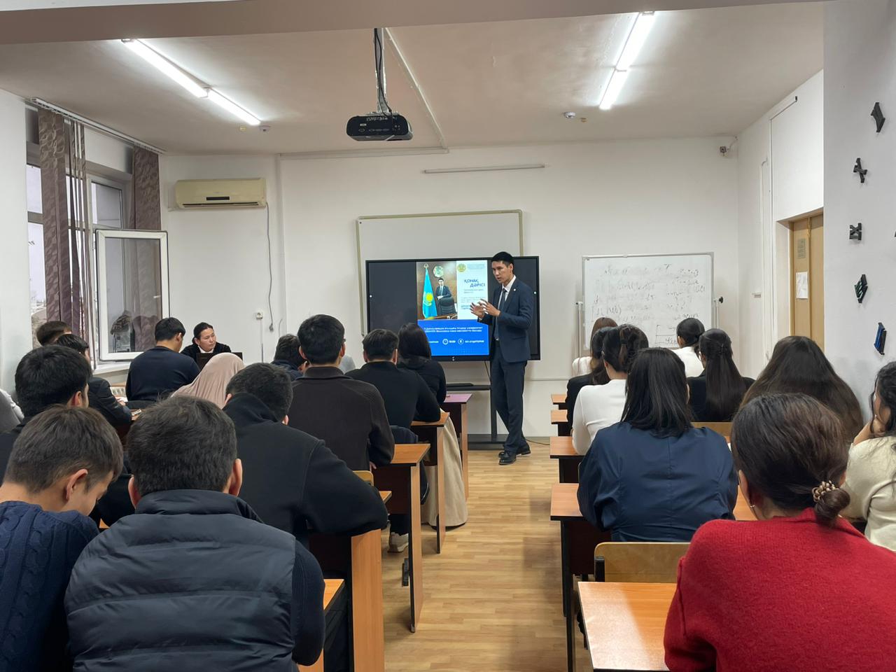 A guest lecture was held for fourth-year students of the 6B04103 - Economics and Public Administration program at the Department of Management, Faculty of Economics and Law. The lecture was delivered by Yermek Serikuly Shmaliyev, Head of a Department at the Atyrau Regional Department of Economy and Entrepreneurship. During the session, the lecturer discussed the work processes of government organizations and the current economic situation in the region. He also highlighted the key qualities that a civil servant should possess and shared notable moments from his own career. In the concluding part of the lecture, students asked questions of interest and engaged in a discussion with the guest lecturer.